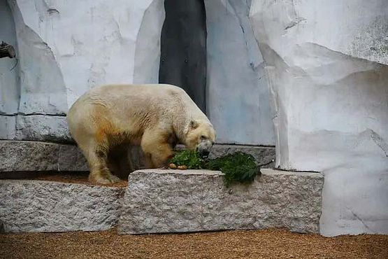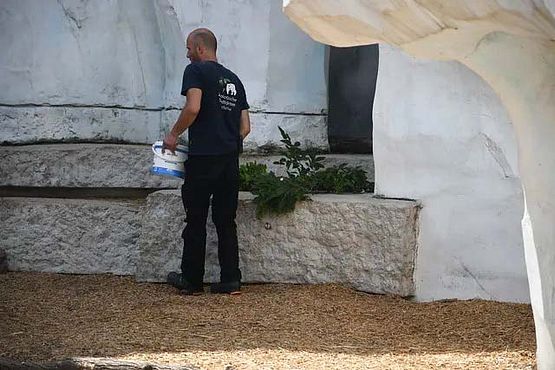 The small enclosure is now being prepared for polar bear Kap. He gets treats, placed in a clearly visible spot. Kap is no longer in a condition to search for anything. He should just develop an appetite and have a nice day.